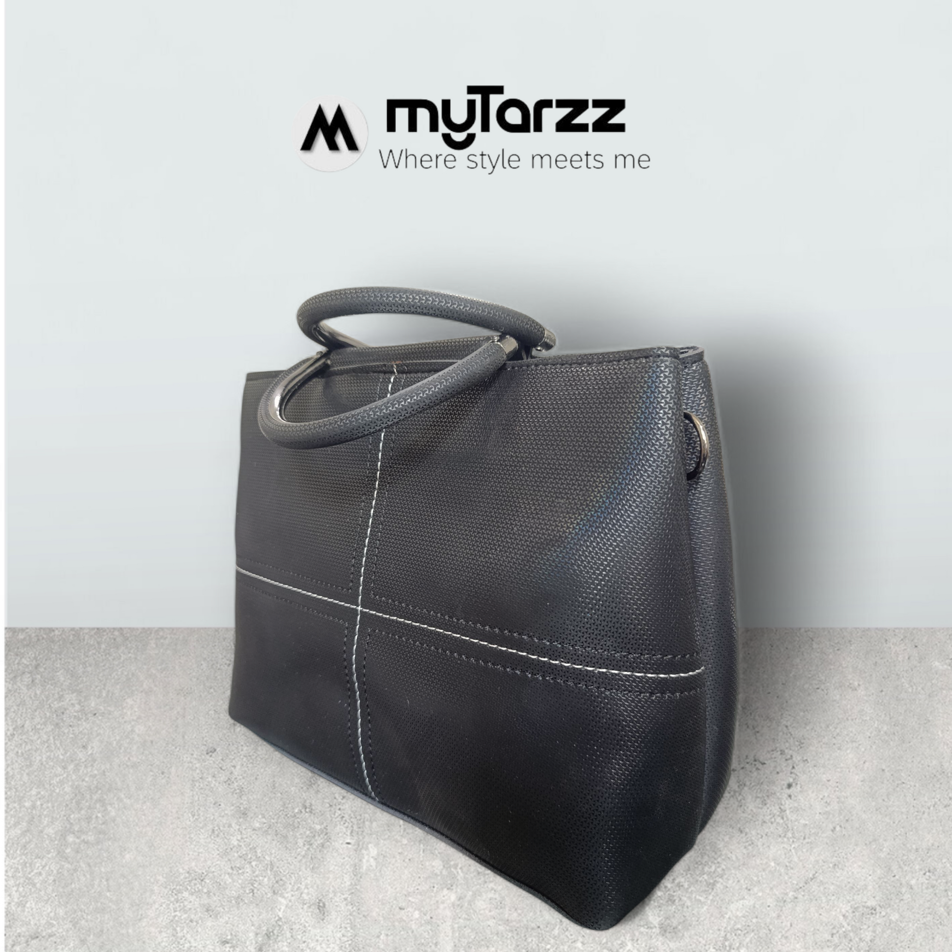This stylish jet black tote bag is the perfect blend of modern design and everyday functionality. Crafted from a unique perforated material, its clean lines and structured silhouette make it a versatile accessory for any outfit. The bag features a classic top handle and subtle, contrasting white stitching that adds a sophisticated touch.