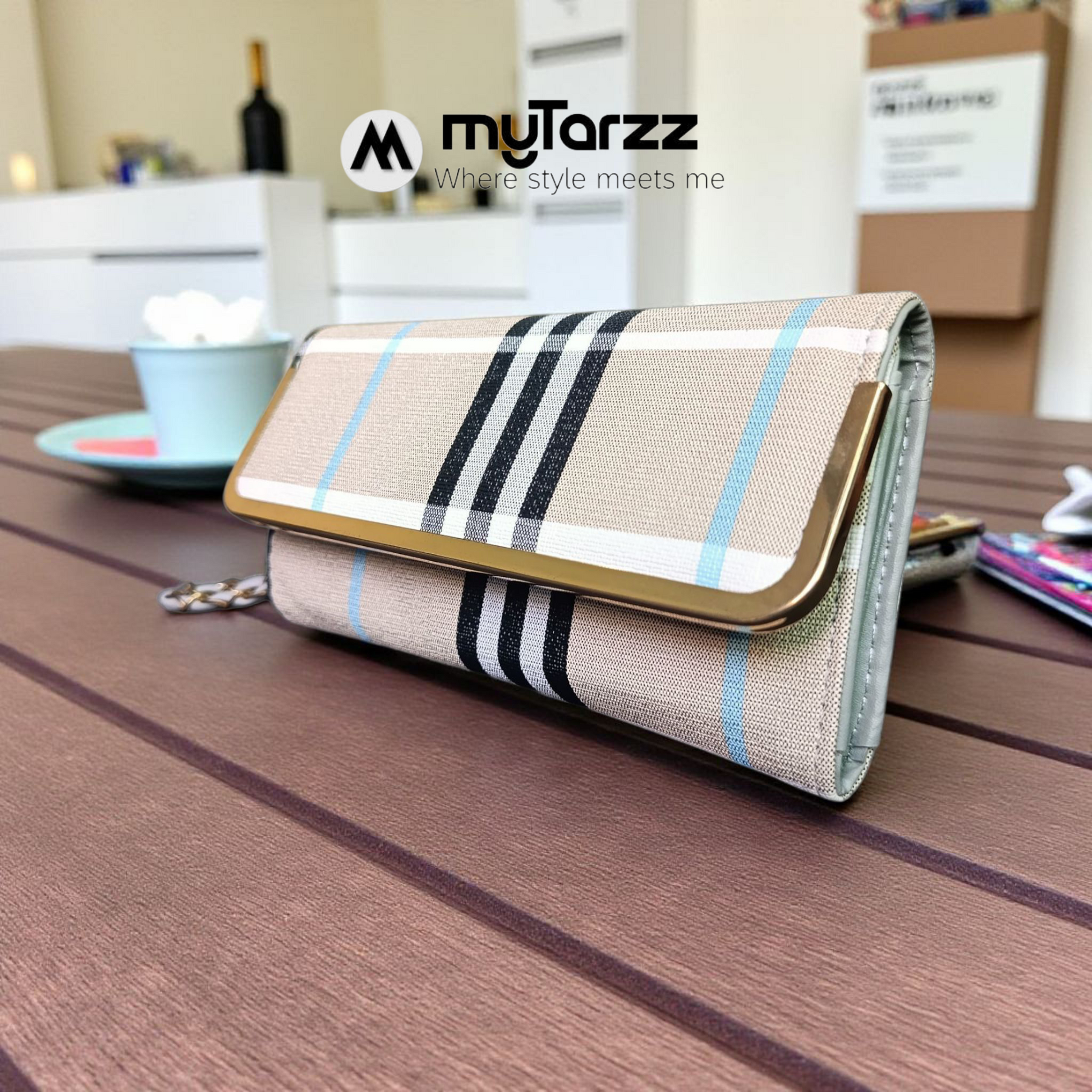 A sophisticated and roomy continental wallet featuring a timeless plaid design accented with a subtle azure blue stripe. The durable, full zip-around closure keeps your contents secure. It includes a detachable chain strap, allowing it to be carried as a chic wristlet or clutch. This is the perfect accessory for organizing all your cards, cash, and coins in style.