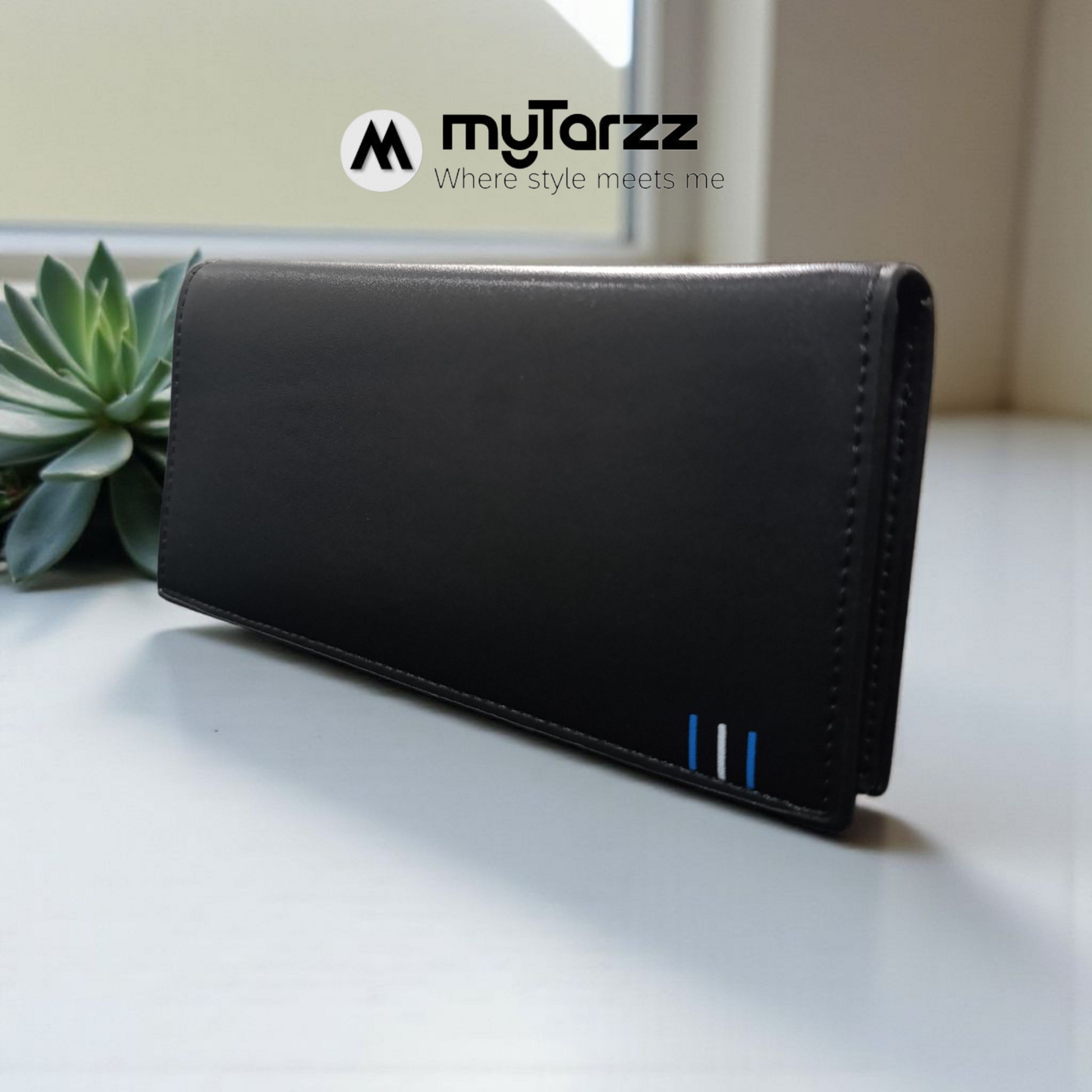 A sleek and professional long-style card holder, perfect for the modern executive. Crafted from smooth black faux leather, this slim bifold design opens up to reveal ample storage for your essential cards, cash, and identification. The interior features a striking blue accent lining near the spine, adding a subtle touch of color and style. The full-length zipped compartment provides secure storage for cash or coins. Its elongated profile is designed to hold international banknotes flat without folding.