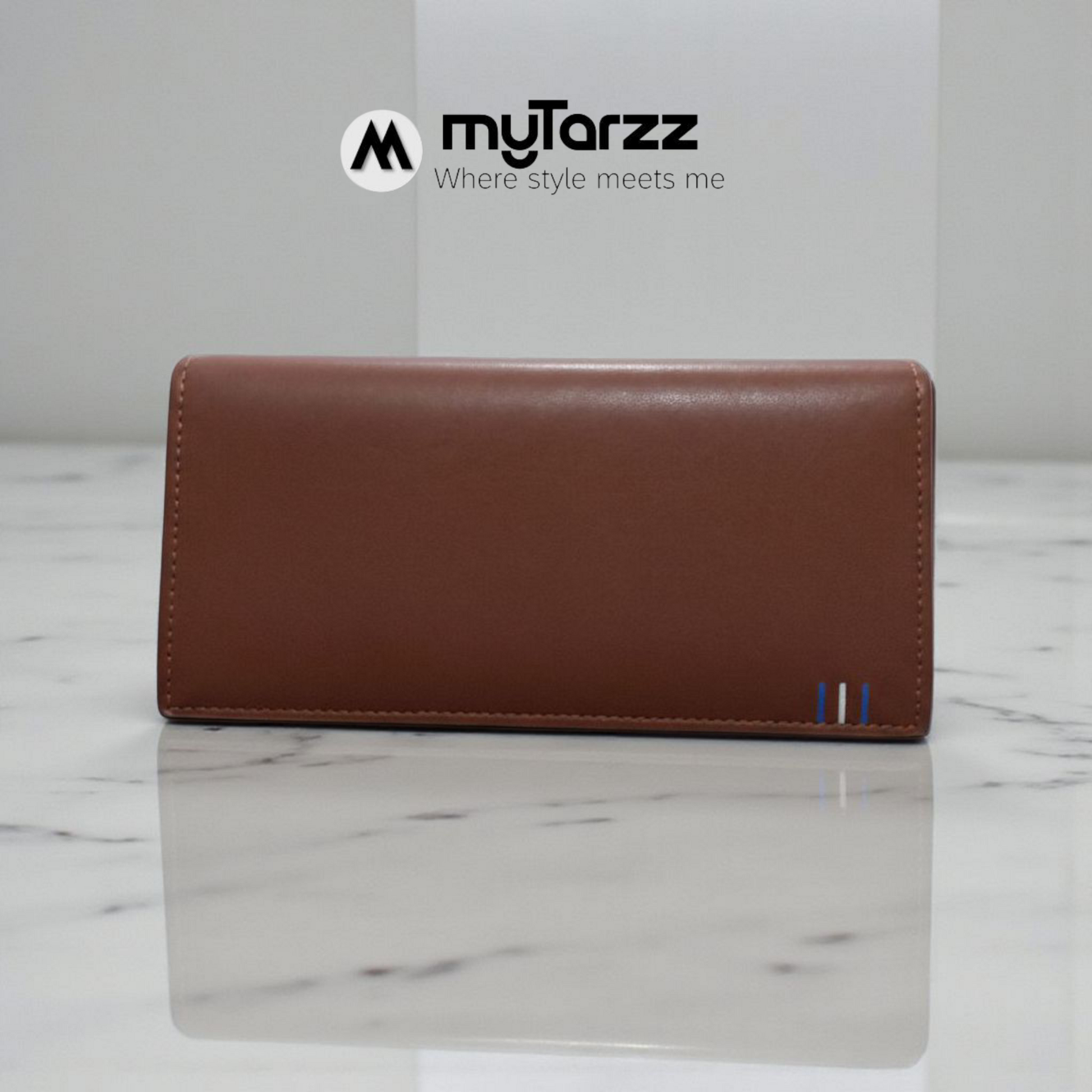 A sleek and professional long-style card holder, perfect for the modern executive. Crafted from smooth brown faux leather, this slim bifold design opens up to reveal ample storage for your essential cards, cash, and identification. The interior features a striking blue accent lining near the spine, adding a subtle touch of color and style. The full-length zipped compartment provides secure storage for cash or coins. Its elongated profile is designed to hold international banknotes flat without folding.