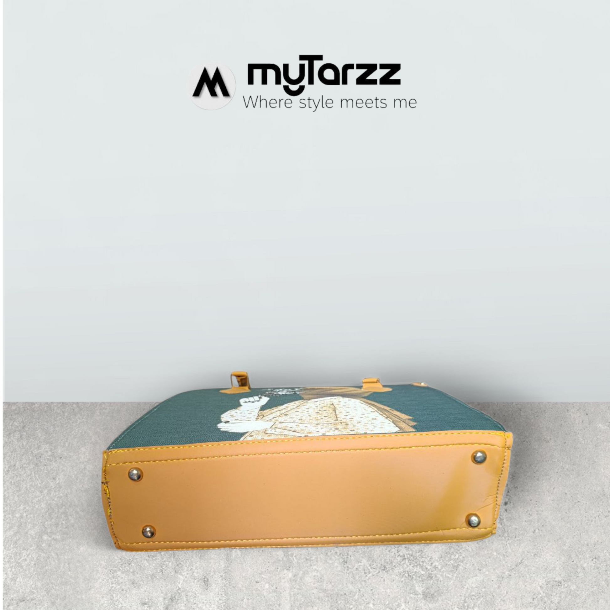 Add an artistic touch to your daily look with our Forest Green & Mustard Artistic Print Tote. This stylish bag features a unique, vintage-style print of a woman in a hijab holding a bouquet of flowers, beautifully set against a deep forest green background. The warm mustard-yellow handles and accents create a stunning contrast, making this handbag a true statement piece. Crafted from durable materials, its structured design ensures you can carry all your essentials with both elegance and ease.