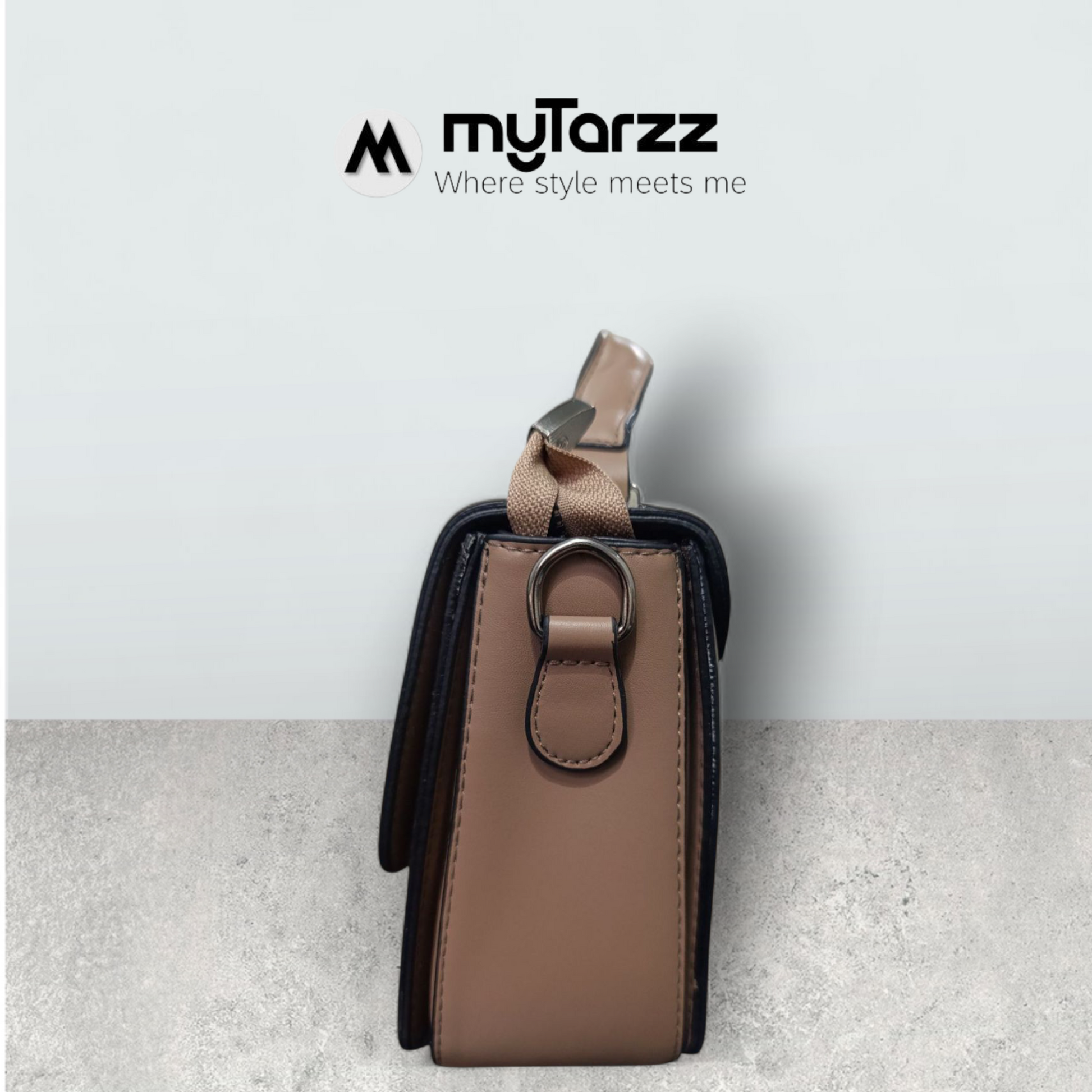 This stylish and elegant two-tone satchel bag is a perfect blend of classic design and modern functionality. Made from a smooth faux leather, it features a crisp white top and a warm taupe bottom, creating a striking contrast. The structured shape, combined with decorative buckle straps and a sleek top handle, makes this a versatile accessory for any occasion.