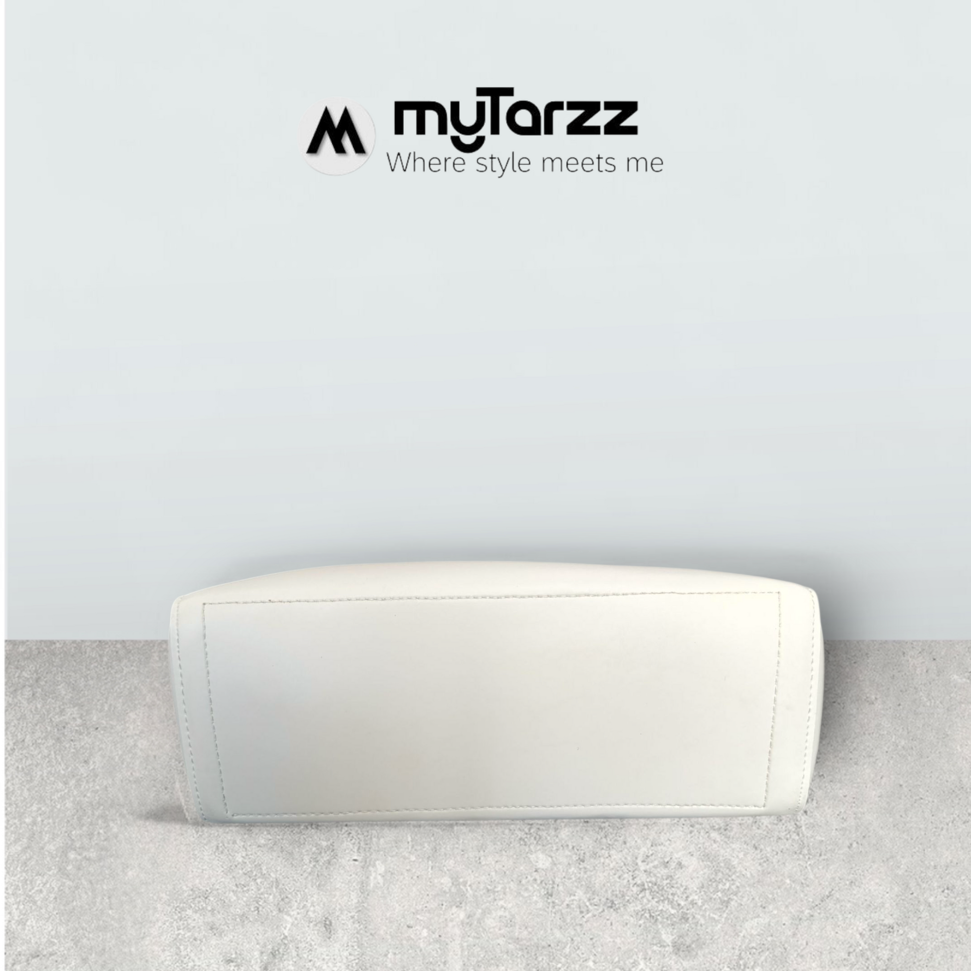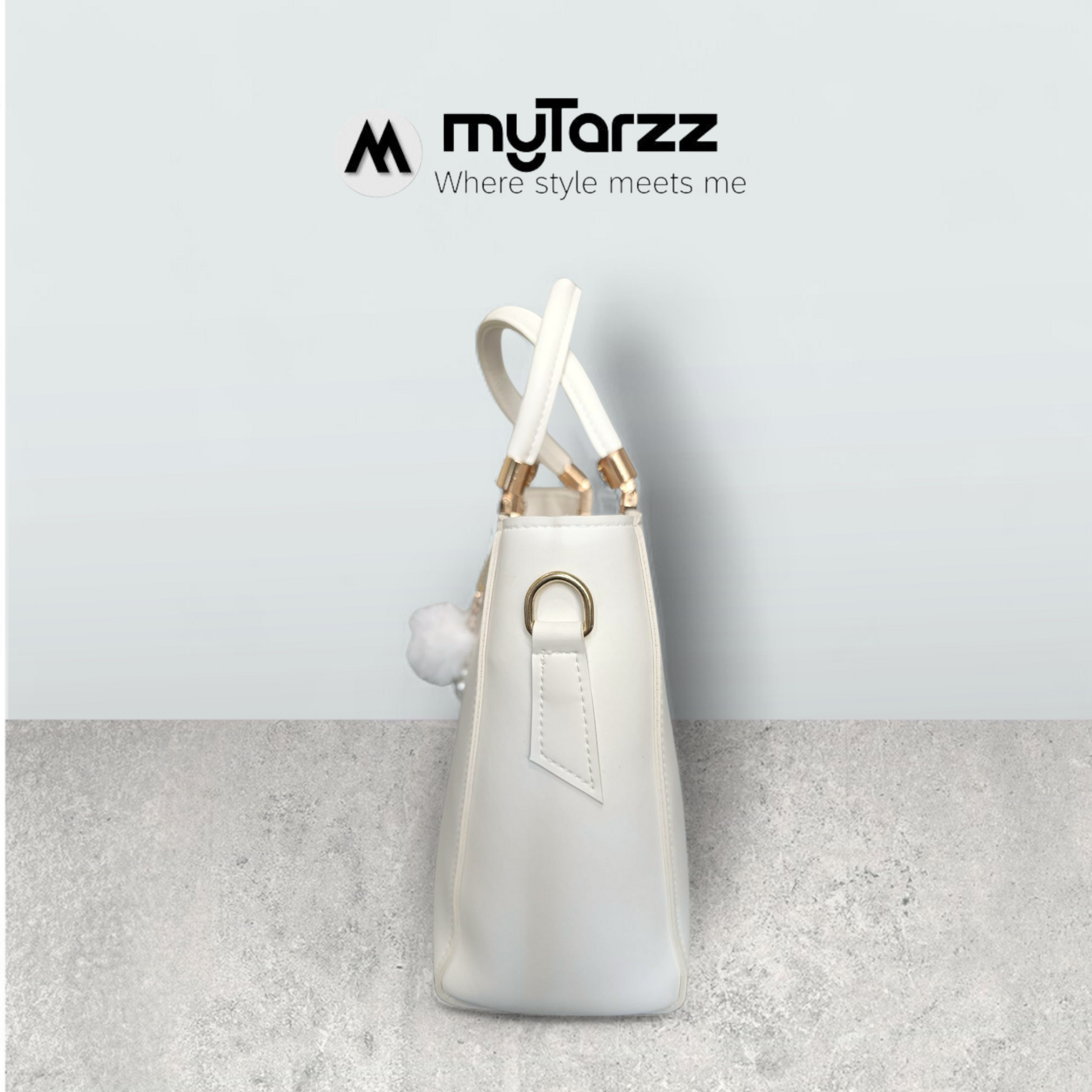 This stylish and elegant white tote bag is the perfect blend of classic design and modern charm. Made from smooth faux leather, its structured shape and clean lines create a timeless silhouette. The bag features unique gold-tone metal handles that add a luxurious touch, along with a playful white pom pom and ribbon charm.